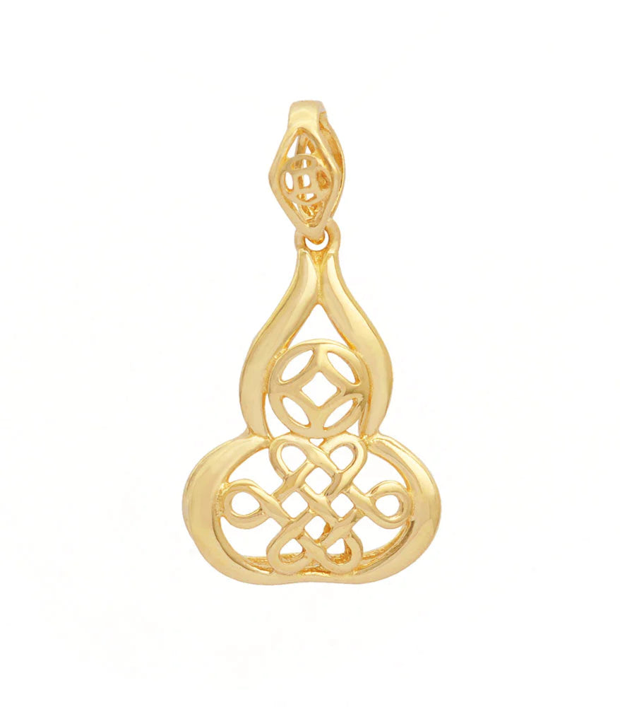 This pendant consists of 3 very auspicious symbols. The wu lou is a symbol of good health. Many Taoist deities, such as the God of Longevity and Eight Immortals, carry the wu lou. The coin is a powerful emblem of wealth and prosperity, and the Mystic Knot is a symbol of wealth, health, and happiness.