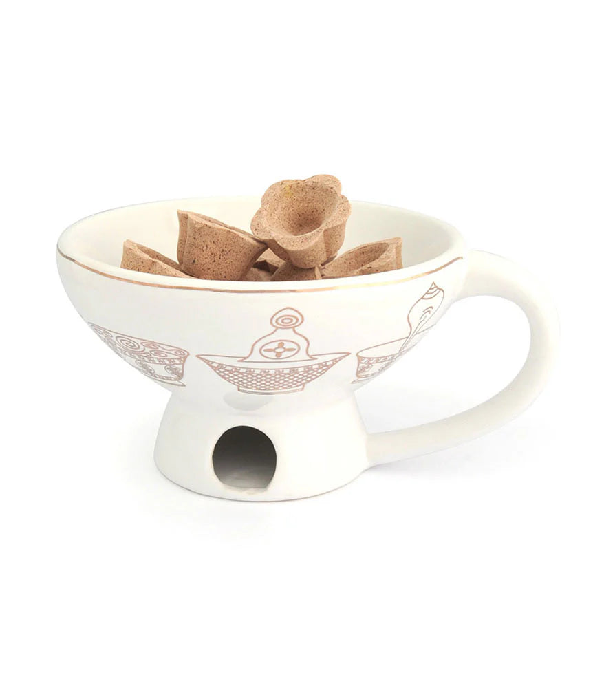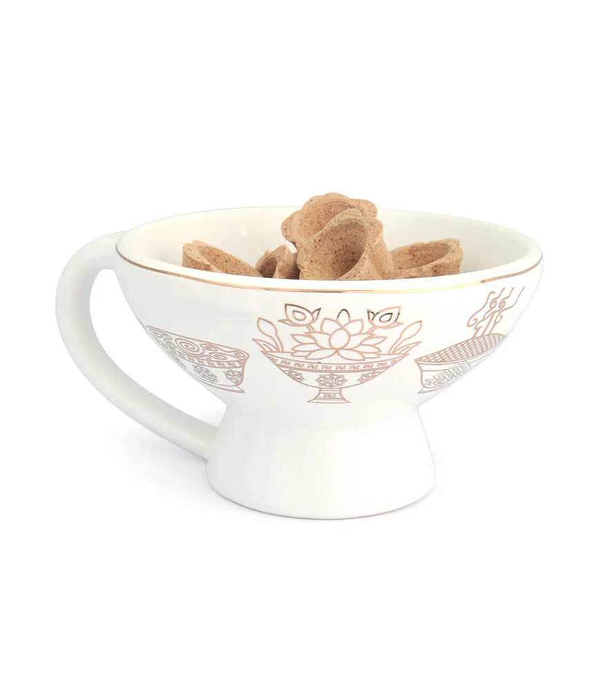 This beautiful porcelain incense holder, a symbol of the fire and air elements, is designed to make it easy for you to perform incense offering rituals as often as needed. An incense offering ritual uses these elements to clear away stagnant energy in a home, and to appease spirits, local landlords and protectors that could bring mischief or obstacles to your life. The side of this gorgeous bowl is decorated with the special auspicious eight offerings in gold, symbolizing the offerings made to all the spirits, local landlords, protectors and deities which surround your home, making it incredibly beneficial when offered together with incense.