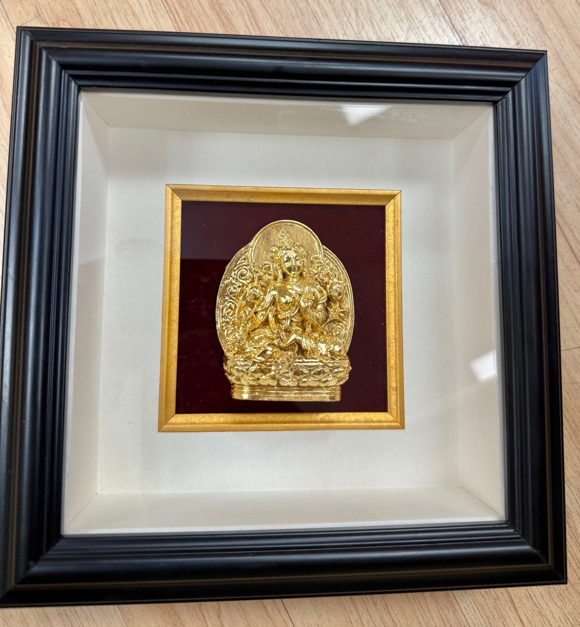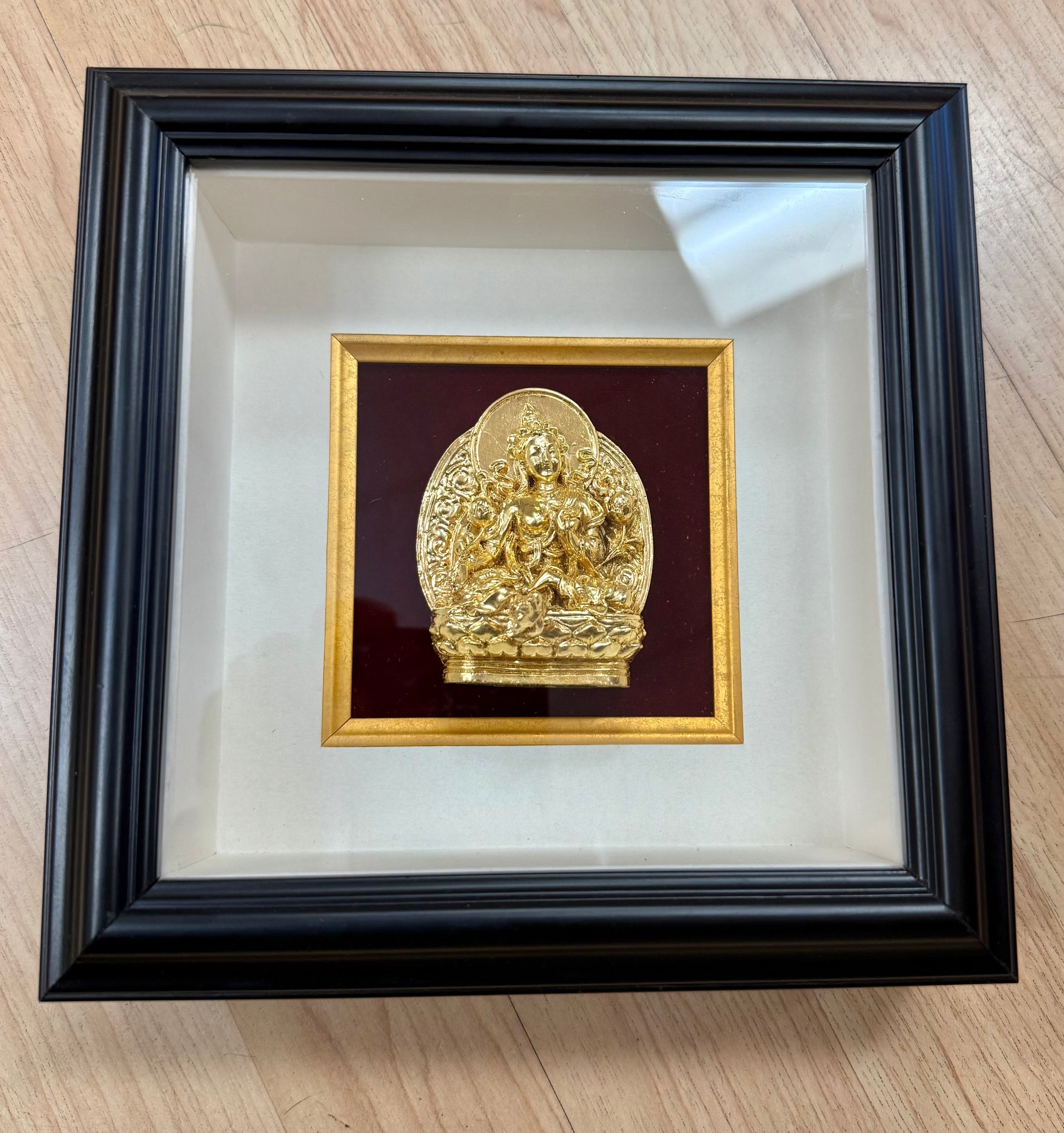This stunning Green Tara frame helps you to overcome all manner of obstacles and problems. Green Tara is the Swift Liberator and the Mother of all Taras, and grants wishes and dissolves troubles whenever you call on her help. She also protects you from the eight fears: thieves, black magic, water, poverty, fire, injustice, bullies, and poison.