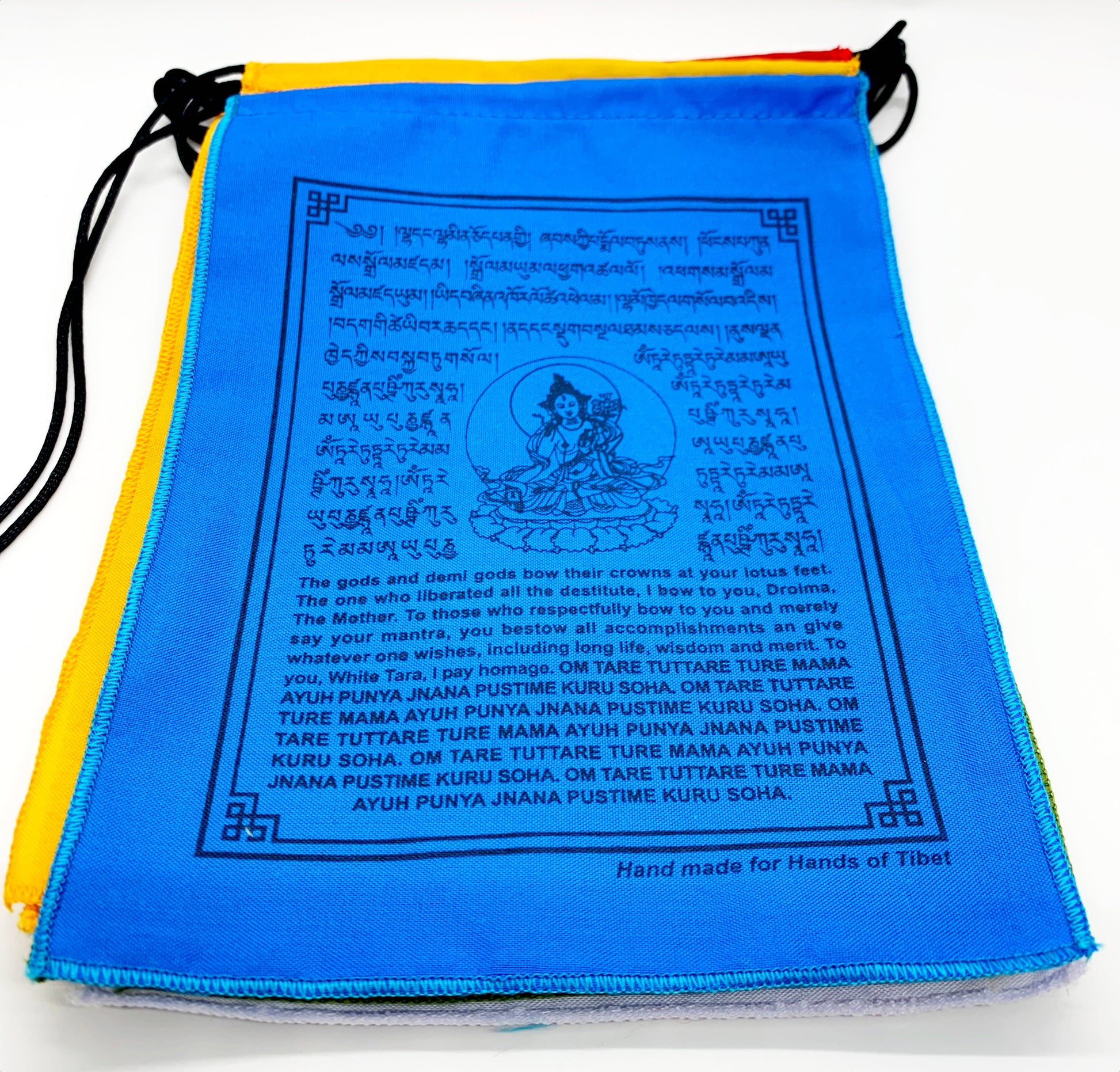 Increase your personal success luck, blessings and protection by raising the Green Tara prayer flag! Each flag is printed with the image of the White Tara, and special mantras to elevate your success potential.White Tara also help to pacifies severe anger and illness. She protects you from dangers brought by ingesting poisons and brings peaceful and happiness.