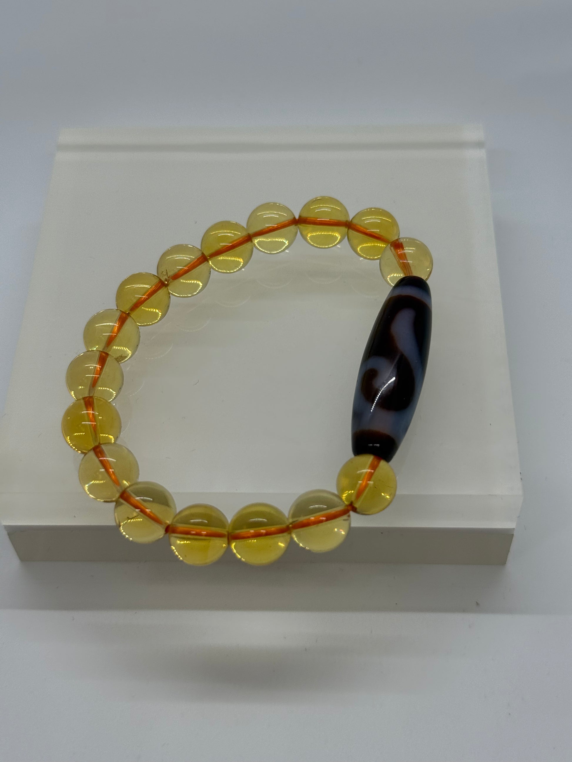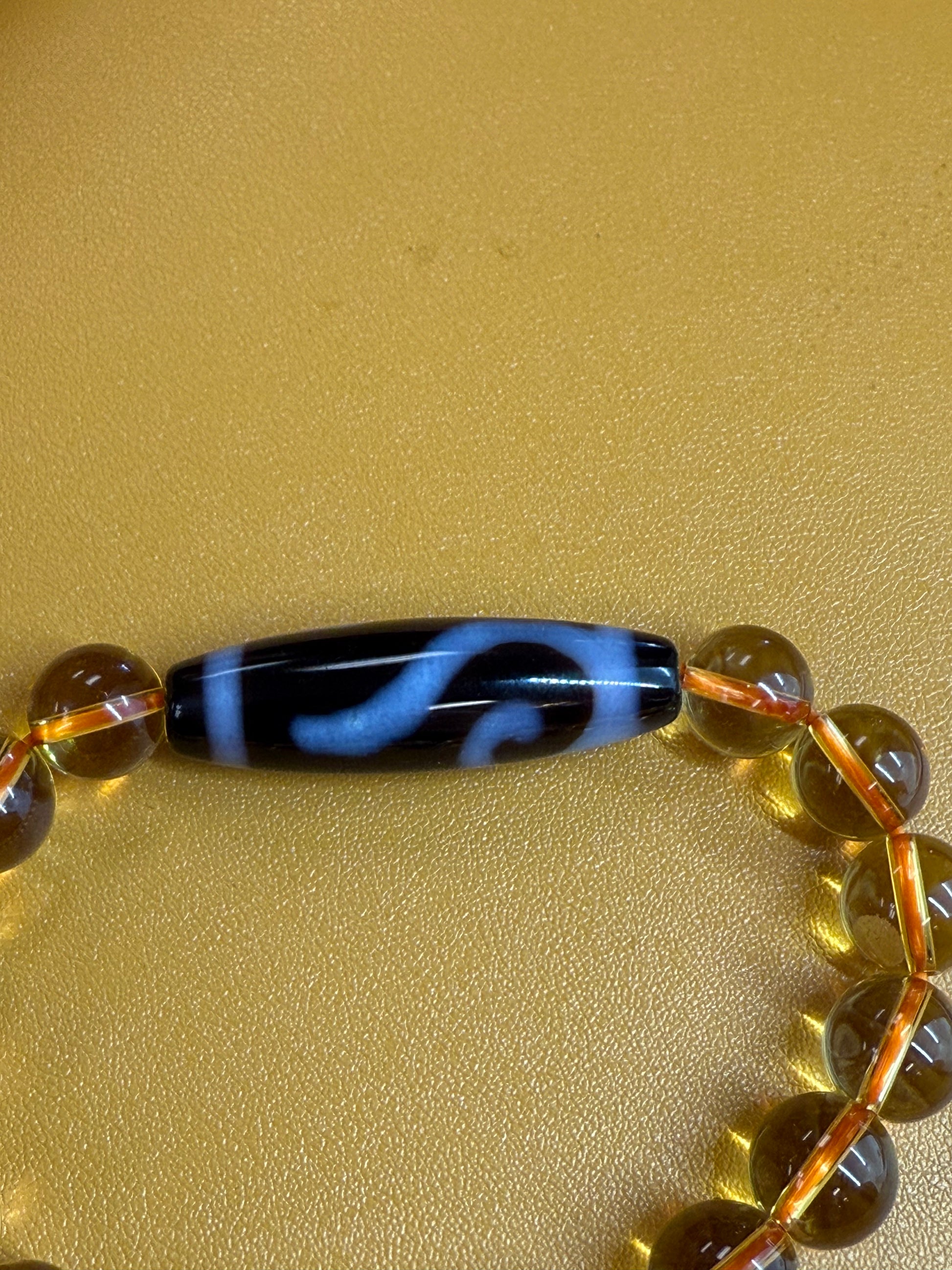The Money Hook DZI bead is strung with smooth yellow citrine beads that enormously enhance its power and wealth. This money hook DZI and citrine will attract wealth luck.