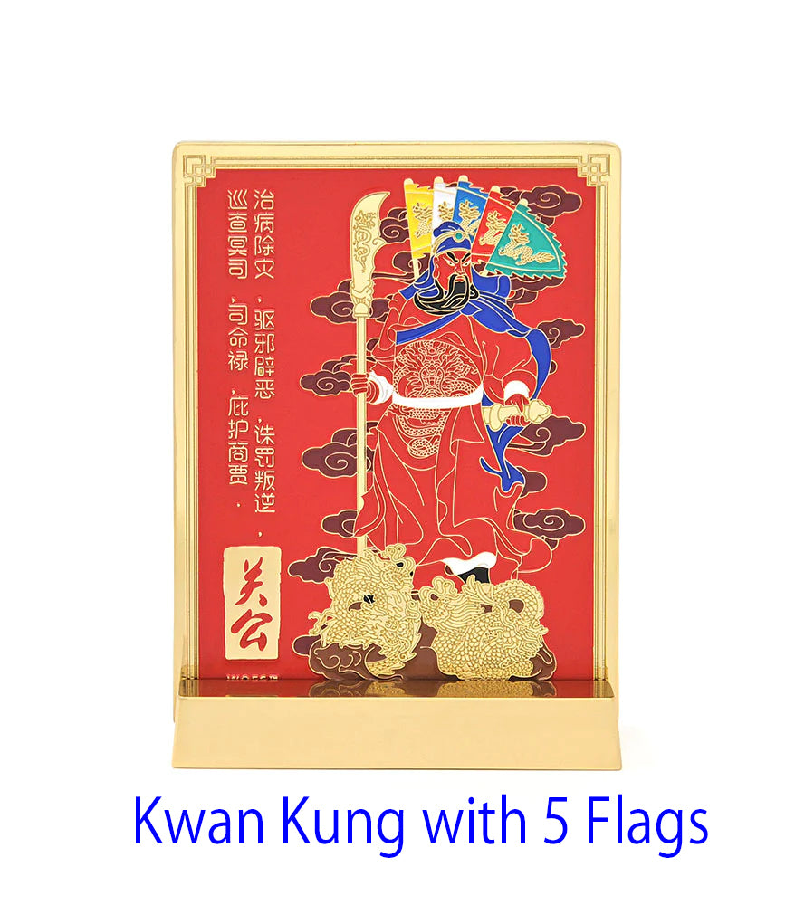 Shown here with red face and red robes featuring multiple dragons, he gives you the courage to take risks, to try new opportunities, to move forward with new ideas, while protecting your flank against rivals. Depicted with 5 Flags, he signifies that victory is already yours!