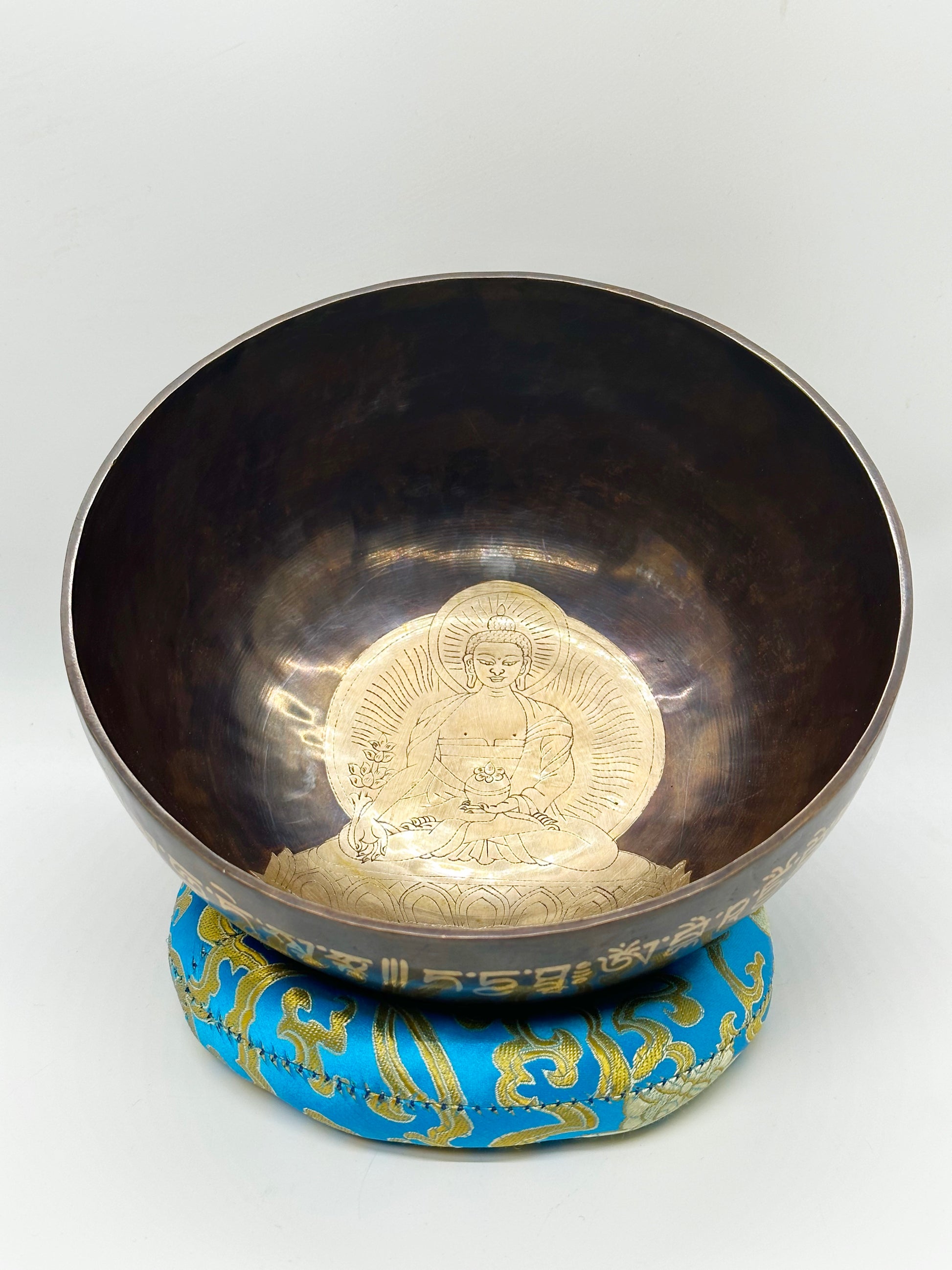 This singing bowl features the Medicine Buddha and his mantra on the bowl.