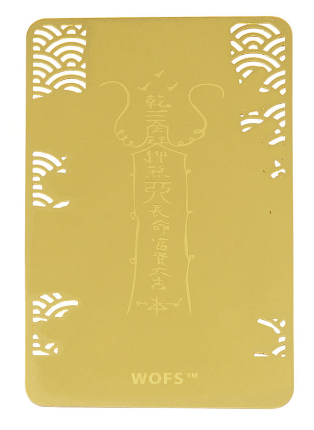 Carry this amulet card with a secret talisman for protection against falling sick. It features a pair of cranes for good health and longevity of good fortune, a pair of peaches, the fruit of immortality, and bamboo to symbolize resilience against any odds.