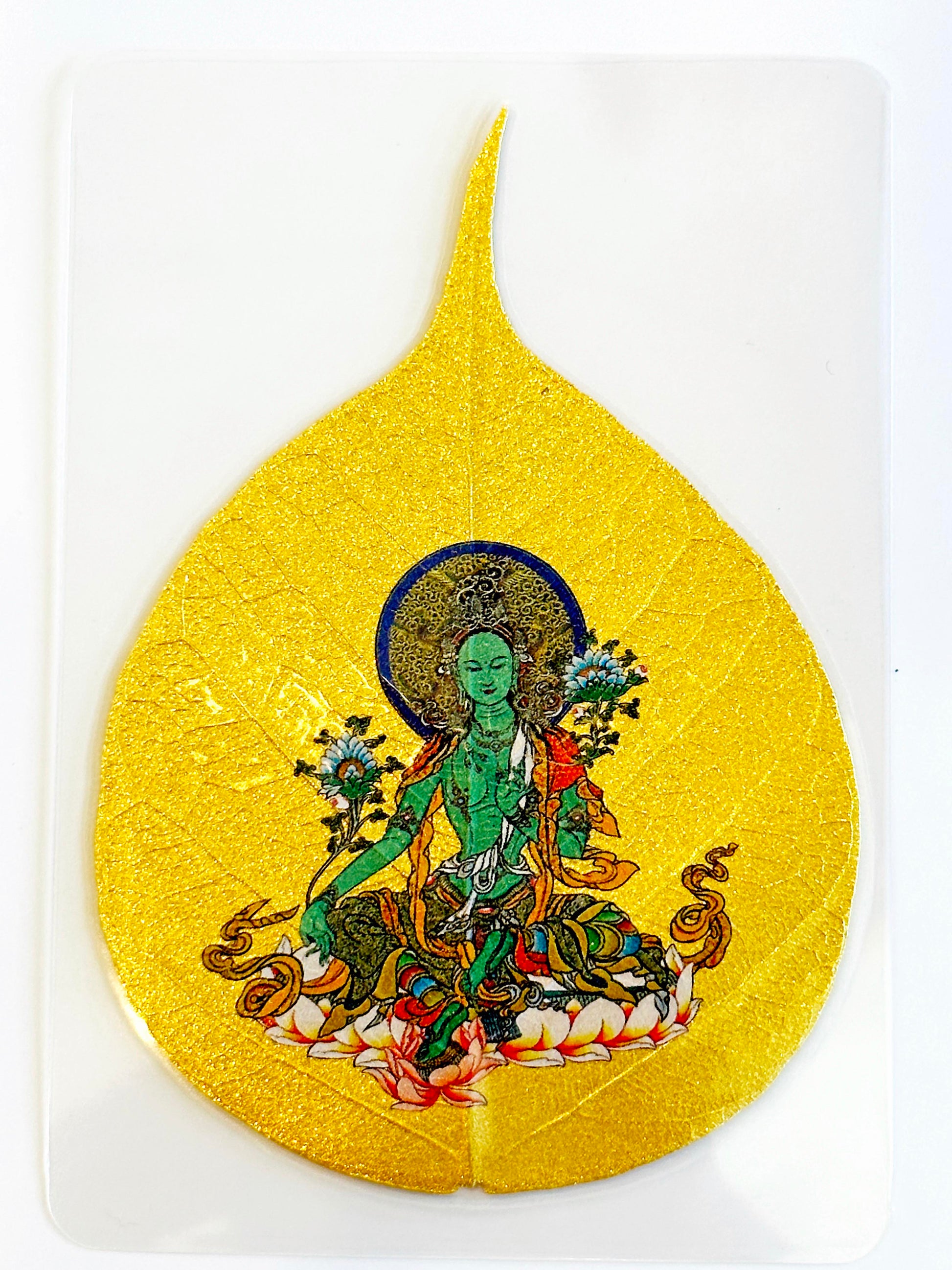 Goddess Green Tara helps one dispel obstacles, keeps one safe from harm, and brings smooth success. Known as the “Swift Liberator,” she acts immediately whenever you call on her for help. Place her benevolent image on your cell phone or keep this card inside your wallet to invoke her protection and blessings. Whenever you need her, gaze upon her image and chant her mantra: “Om Tare Tuttare Ture Soha.”
