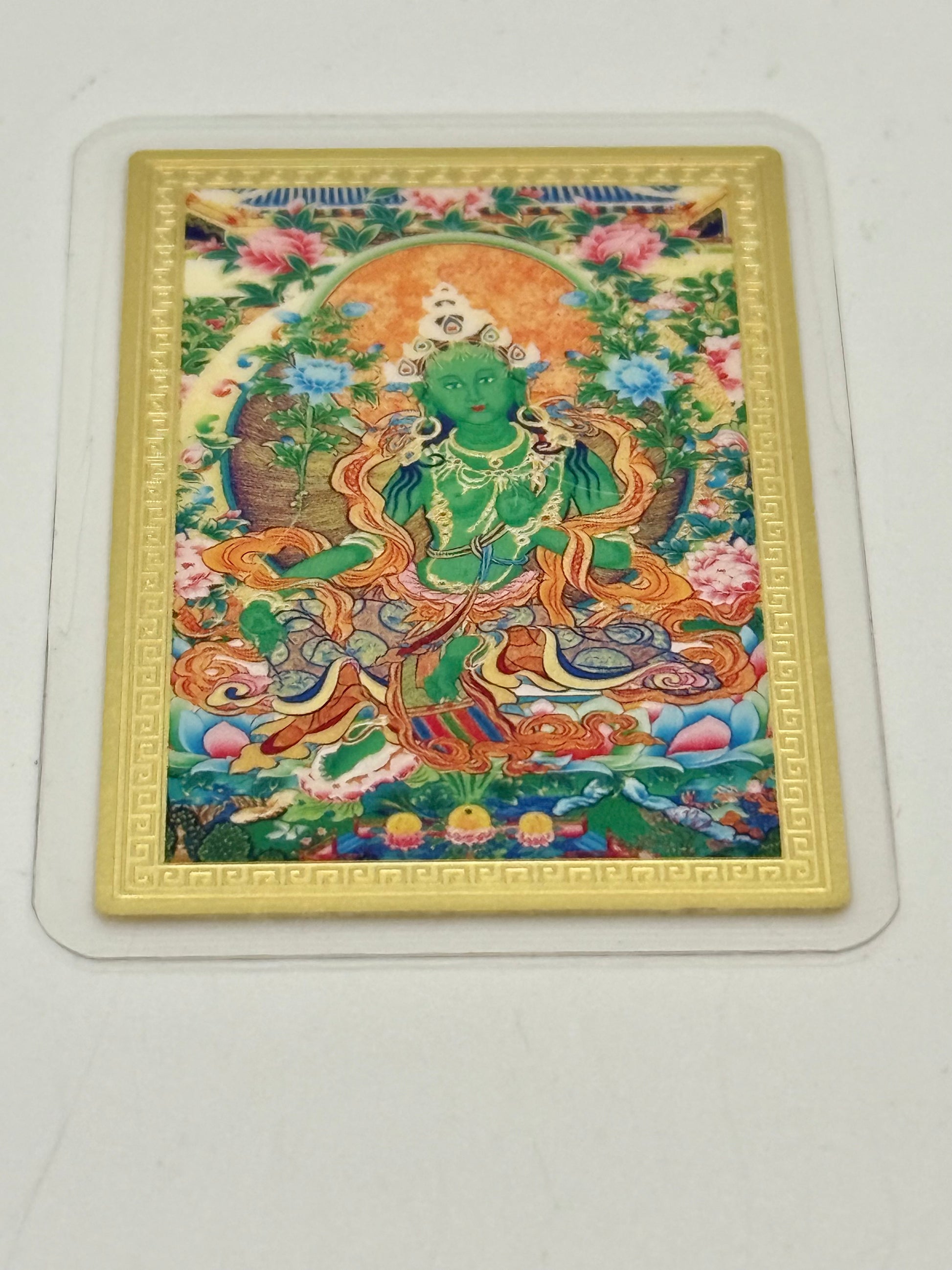 Coming under the blessings of the Goddess Green Tara helps one dispel obstacles, keeps one safe from harm and brings smooth success. Known as the “Swift Liberator”, she acts immediately whenever you call on her for help. Carry this card to invoke her protection and blessings. Whenever you need her, just gaze upon her image and chant her mantra: