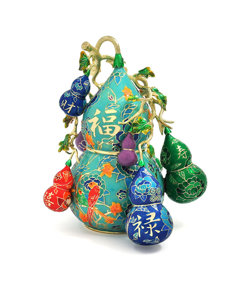 This magnificent cluster of 9 Wu Lou is the ultimate symbol of good health and long life - not just for the body, but also for the mind and spirit. Each Wu Lou is painted with auspicious motifs, including golden pheasants for harmony, coins and ingots for wealth, and healing herbs and flowers for wellbeing.