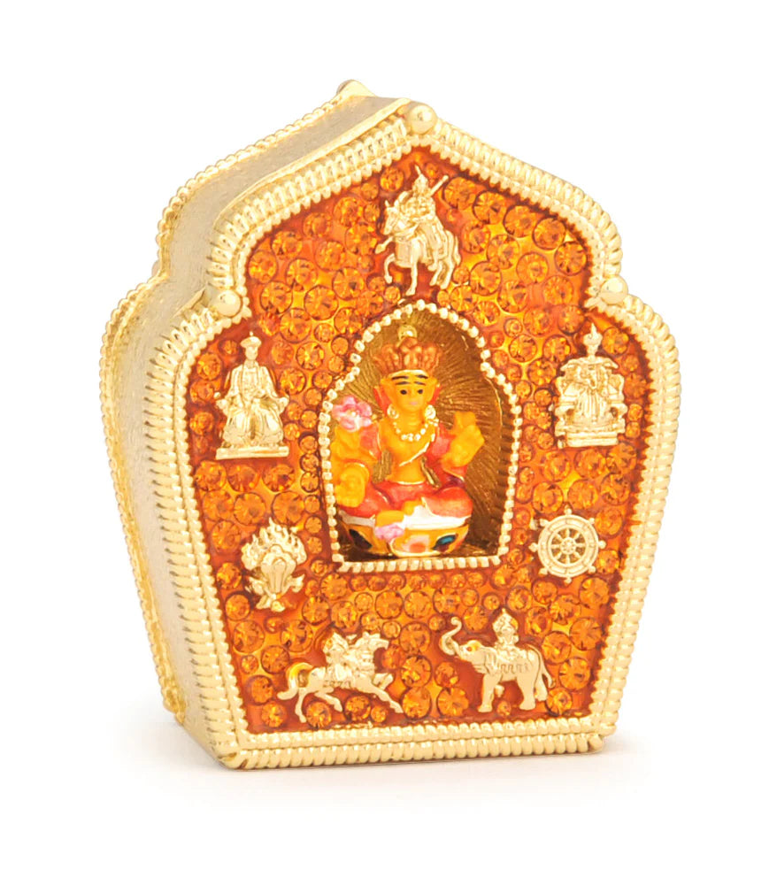 This beautiful TARA GAU not only enhances your home, but it can also be a traveling amulet you can take with you when you travel on holiday or for work. It emanates powerful rays of invisible golden light wherever you place it – even inside the suitcase – or in hotel rooms. And even as you travel, it keeps your home safe. This Tara Gau is decorated with yellow gemstone crystals that invoke the power of Golden Tara!