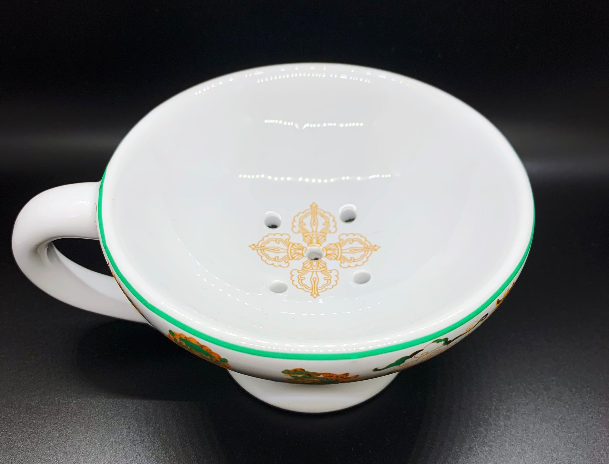 This beautiful porcelain incense holder is designed to make it easy for you to perform incense offering rituals as often as needed. An incense offering ritual uses the fire and air element to clear away stagnant energy in a home and to appease spirits, local landlords, and protectors that could bring mischief or obstacles to your life. The side of this gorgeous bowl is decorated with the Garuda which is a mythical animal associated with removing illness and sorting out health problems. Thus you should use this burner if you would like to invoke the help of the Garuda to remove illness-bringing energies from your home.