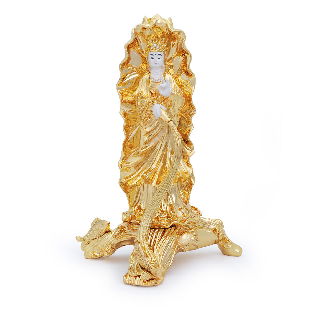 Kuan Yin, also known as the Goddess of Mercy and revered by millions of Chinese around the world, is one of the most popular Chinese deities and the female personification of the compassionate Buddha. This standing posture of Kuan Yin with a pair of carp brings happiness, wealth, and protection from harm.