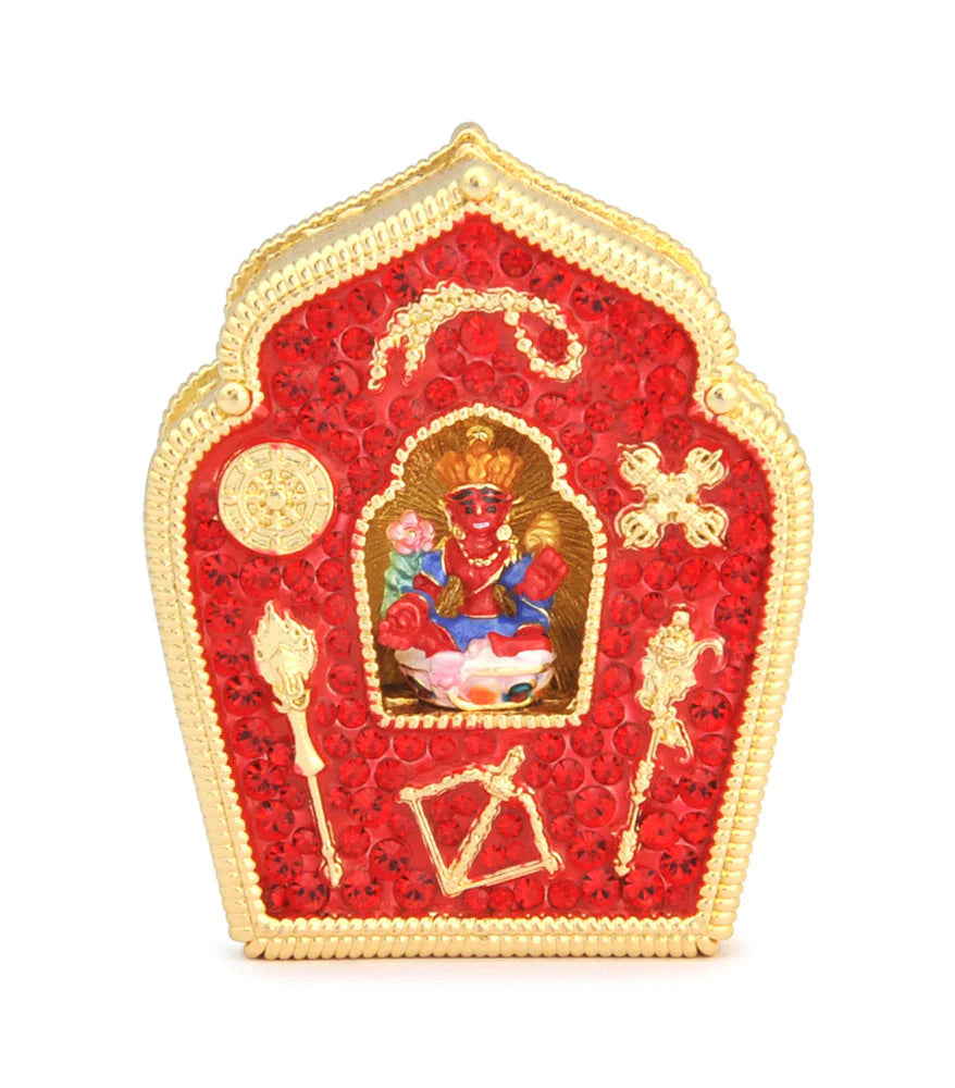 This Red Tara Gau features exquisite Red Tara in the center, surrounded with brilliant red gemstone crystals that invoke the power of Red Tara. It also features the implements of Kurukulle, one of the emanations of Red Tara, who has the power to help those who wish to enhance their luck in love and their relationships with friends and colleagues or associates at work.
