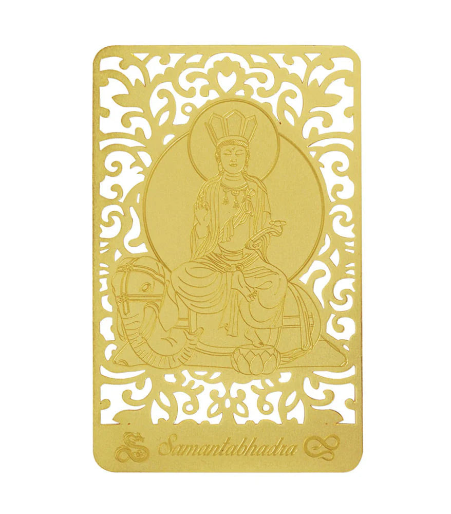 Samantabhadra is the Lord of Truth, representing the meditative practices of all the Buddhas. Alongside Shakyamuni and his fellow disciple Manjushri, he forms the Shakyamuni trinity. He is the patron of the Lotus Sutra. Carrying this talisman in your wallet brings longevity luck to the Dragon and Snake, helping you overcome all misfortunes associated with Spirit Harm and bringing unexpected good news.