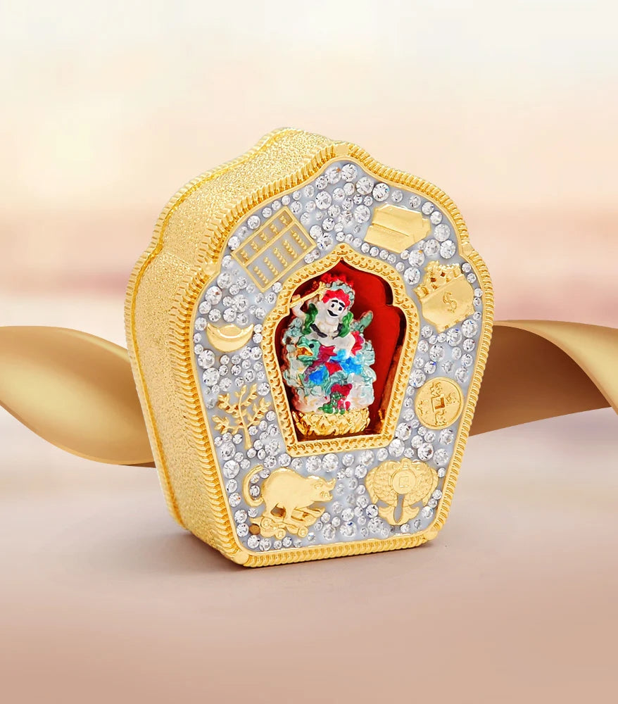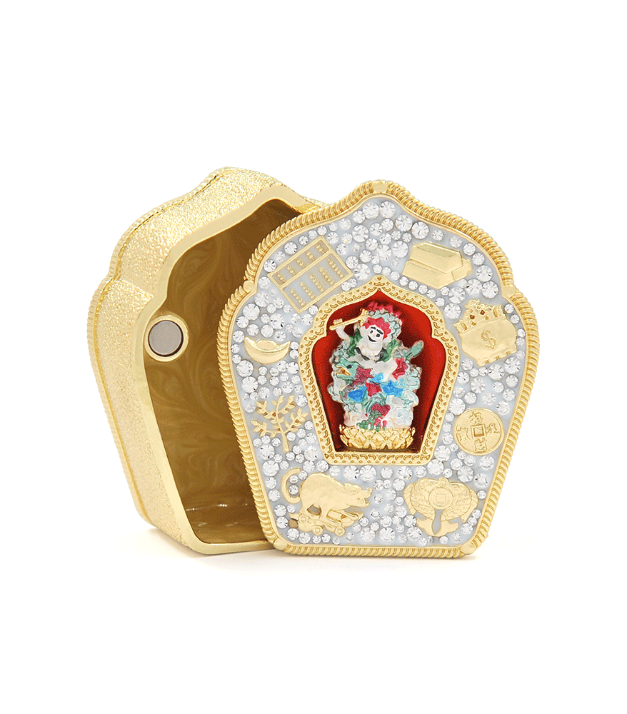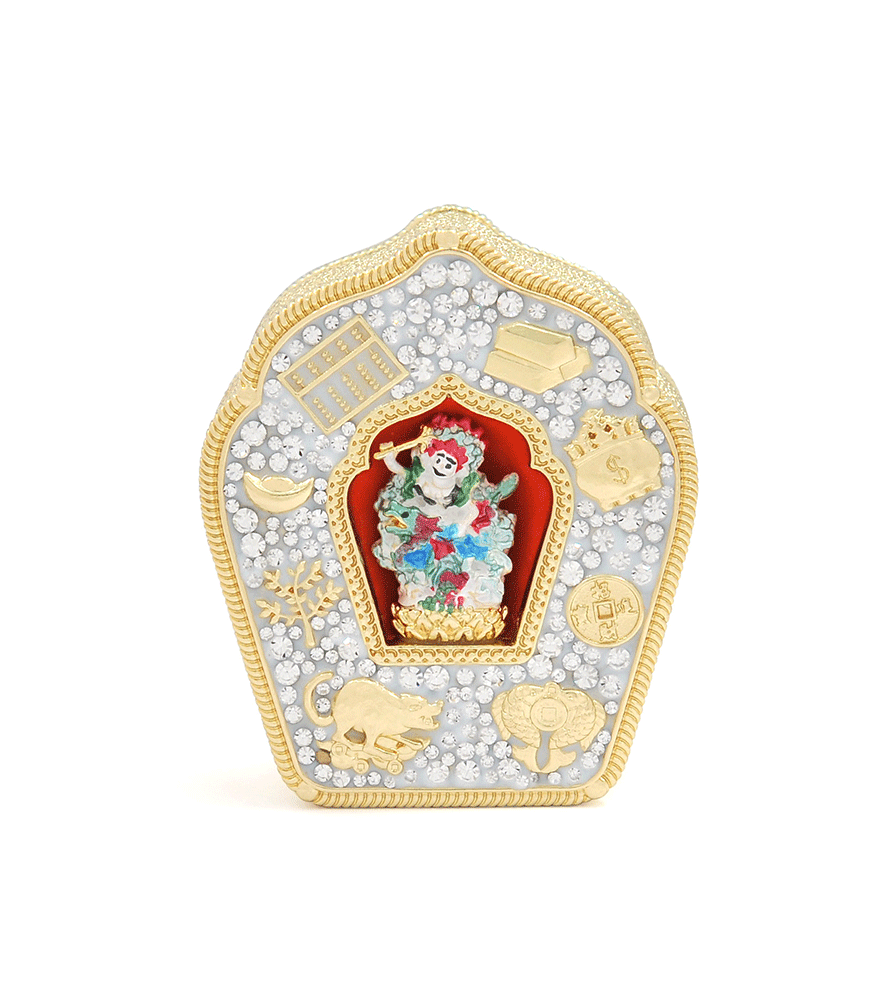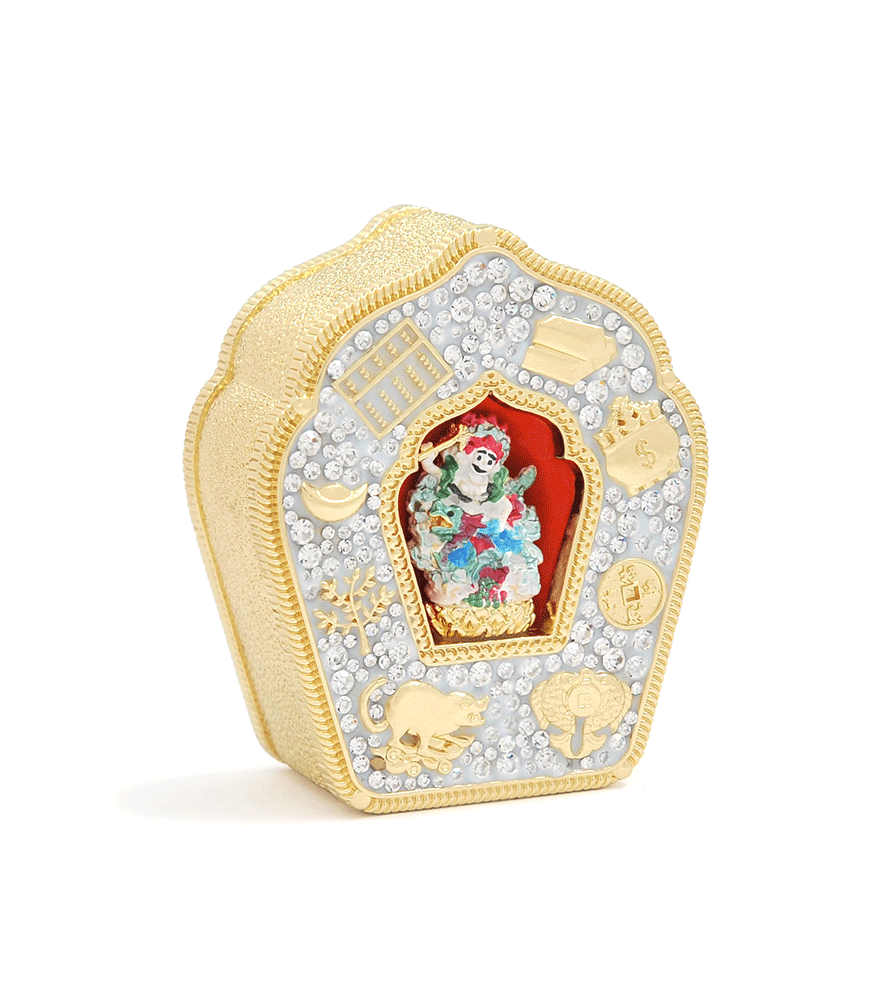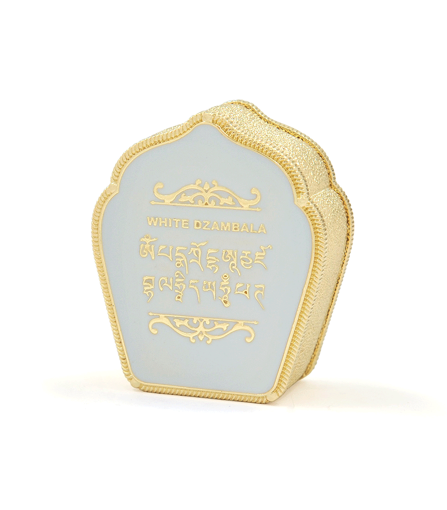 White Dzambala is the wealth-granting aspect of the Compassionate Buddha. He rides an Azure Dragon and is revered for his ability to bestow wealth, abundance, and prosperity. Invoke his blessings to overcome financial obstacles, to attract new wealth, and to accumulate spiritual merit. This beautiful Gau is adorned with powerful symbols of wealth – the jewel-spouting mongoose, the Double Fish, the Wealth Pot, the Abacus, gold bars, a golden ingot, a money tree, and an I-Ching coin.