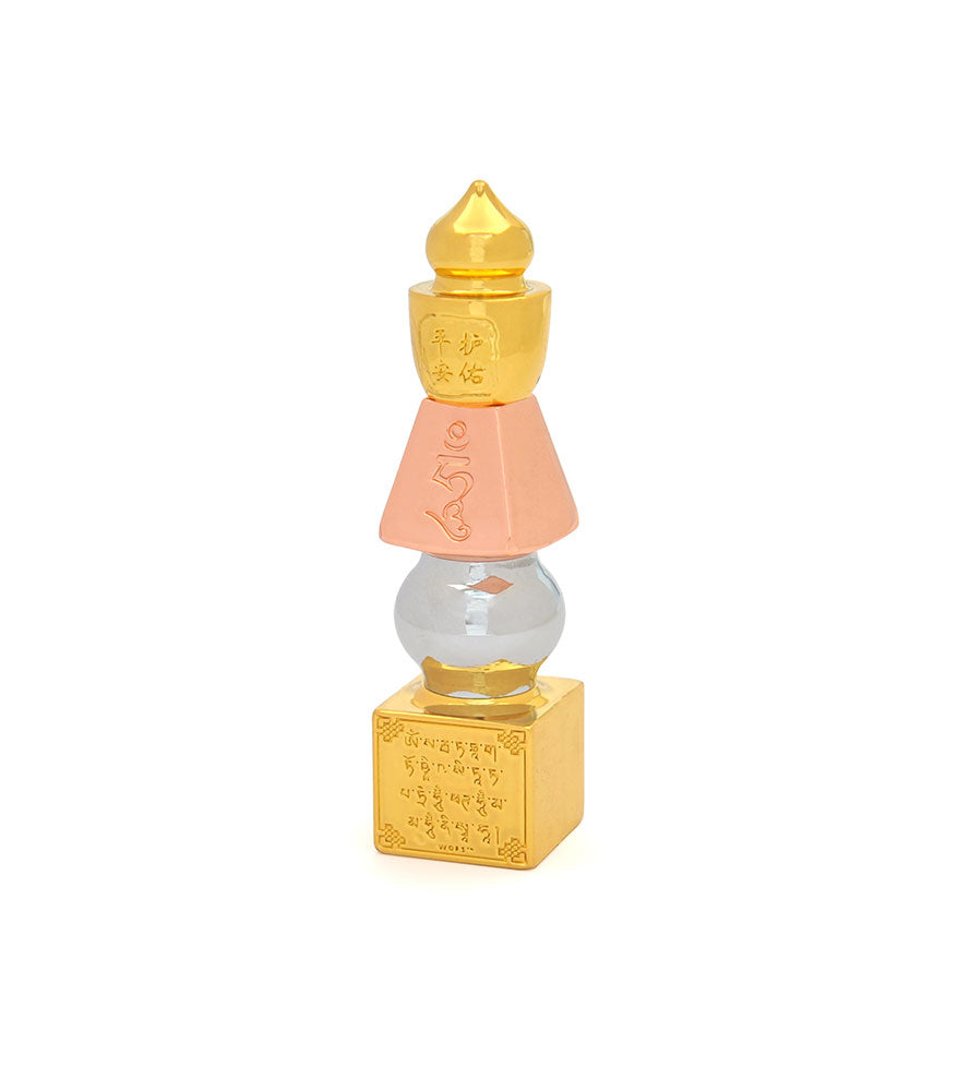 This year’s Five Element Pagoda features the White Umbrella Goddess mantra on its base, with the Chinese couplet “Bringing peace and protection against harm.” The White Umbrella Goddess is a deity who manifests her power with her thousand heads, arms, and legs; it is believed that just viewing her mantra protects against illness, disasters, and spiritual harm and brings great auspiciousness.